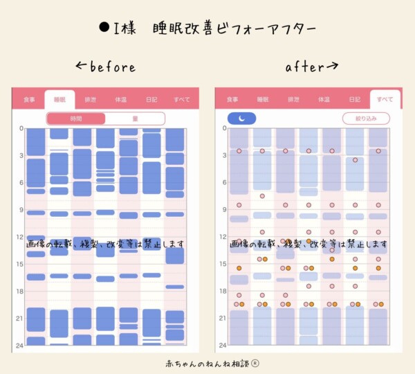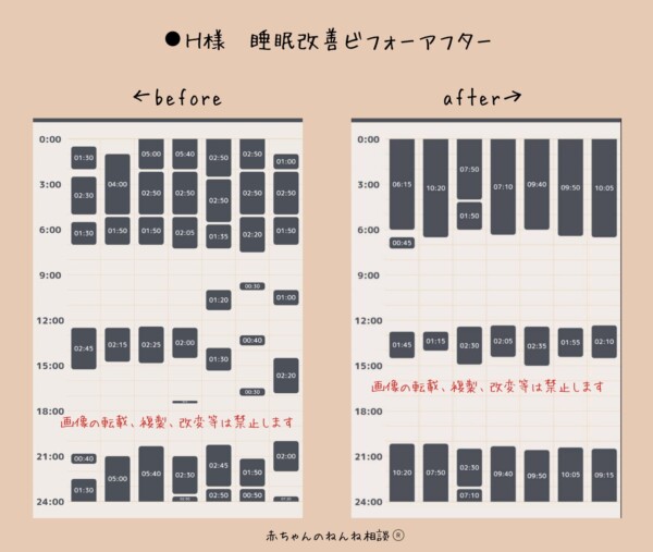 親子共にぐっすり寝られるように。寝不足故に多くなっていたお昼寝も、夜間の睡眠が増えることでお子さまに合った昼寝時間になり、親子の頑張りでお昼寝のリズムもしっかり定着。