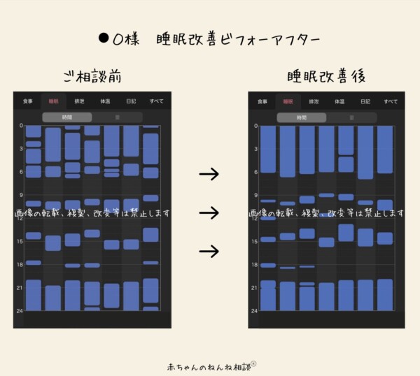 親子共にぐっすり寝られるように。寝不足故に多くなっていたお昼寝も、夜間の睡眠が増えることでお子さまに合った昼寝時間になり、親子の頑張りでお昼寝のリズムもしっかり定着。