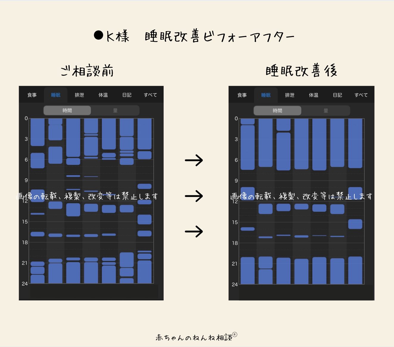 お子さんの体調不良、ご自身の体調不良もありながら、本当にお疲れさまでした。お子さまの変化と同様、K様の表情や言動がどんどん変化していく様子が、「子供だけでなく保護者も寝れる育児を」と考える自分にとって、とても嬉しく感じられました。ありがとうございました。